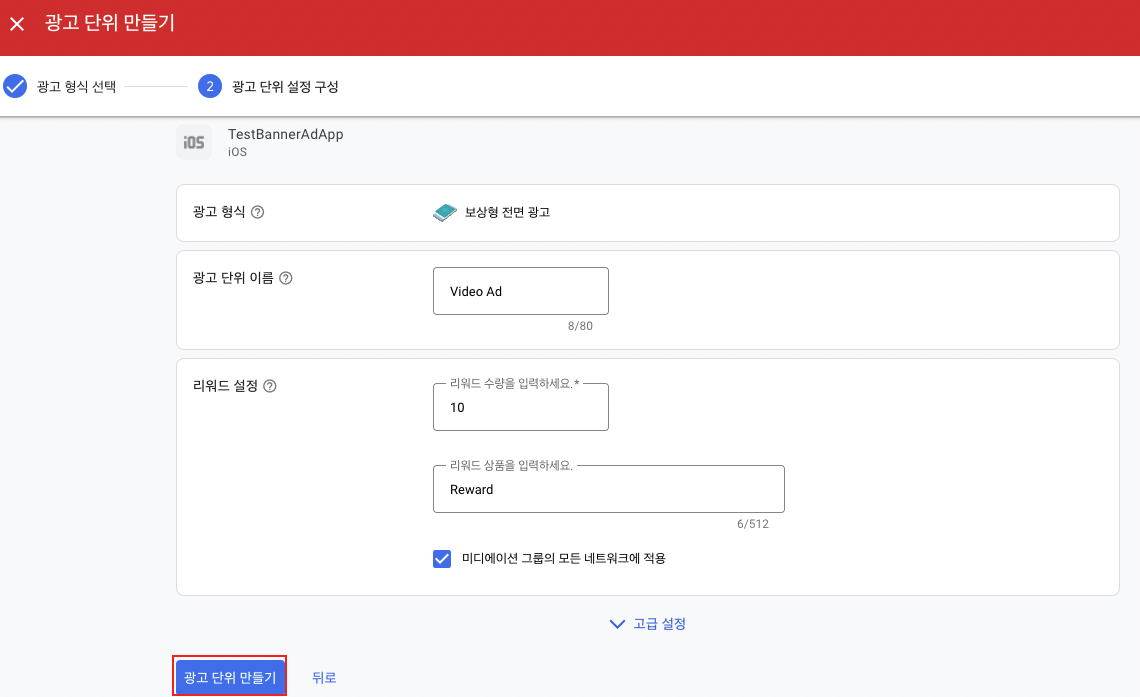 (리워드 수량은 보상형 광고 시청시 지급할 수치를 설정하는 란입니다.)