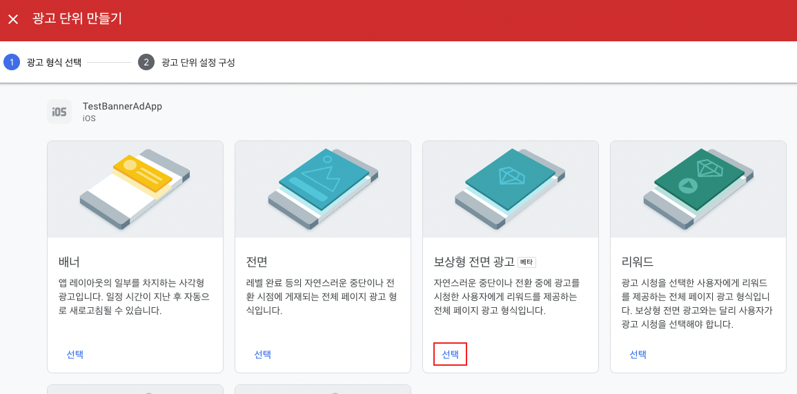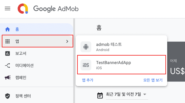 (AdMod 배너 광고를 구현할 때 만들 앱이 있어서 이 앱을 선택하겠습니다. 앱이 없으신 분들은 앱 추가를 클릭하셔서 앱을 생성하시면 됩니다. 앱 추가 방법은 AdMob배너 광고 구현을 참고하시면 됩니다.)