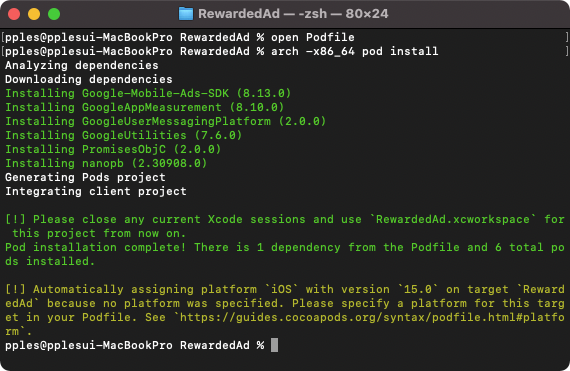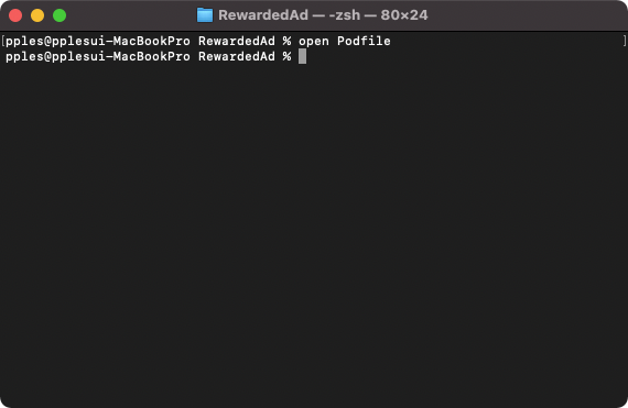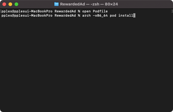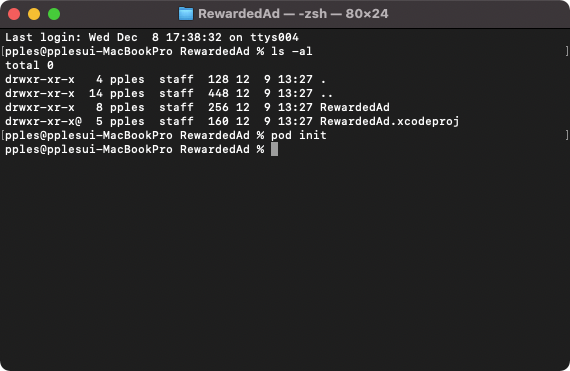 터미널을 열어 RewardedAd 폴더로 이동 > 아래 명령어로 코코팟을 초기화합니다.