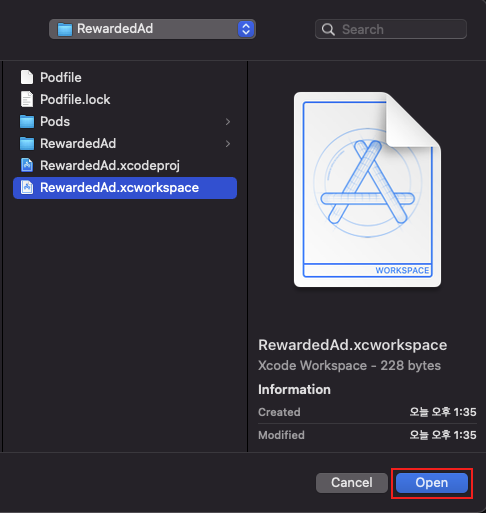 .xcworkspace로 된 파일을 xcode로 엽니다.