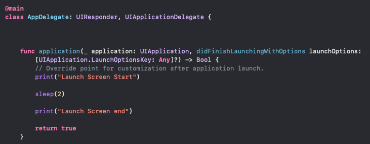 Splash화면을 노출하려면 메인화면에 진입하기 전 지연시간이 필요하므로 didFinishLaunchingWithOptions 함수 안에 지연을 발생시키는 sleep()를 추가합니다. sleep()으로 일정 시간 지연 시 Splash 화면이 노출되게 됩니다.